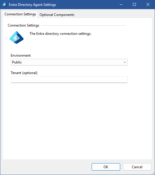 XIA Configuration ClientToolsMicrosoft Online Agent UI Entra Directory Agent Settings Dialog Environment The environment to connect to. Tenant (optional) The name or unique identifier of the tenant organization to connect to - for example "contoso.onmicrosoft.com".