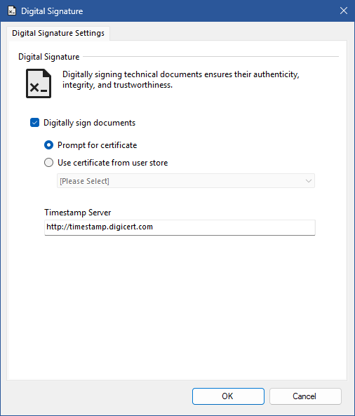 Interactively prompts for a certificate that meets the requirements to use to digitally sign generated documentation.