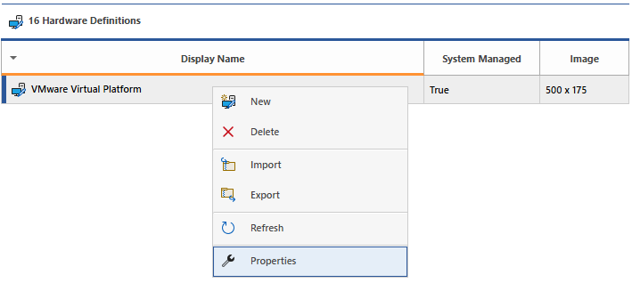 The context menu is displayed when a user right clicks a hardware definition.