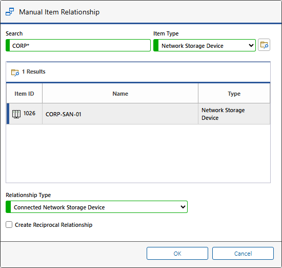 Open the item for editing, and modify the relationships, and select the network storage device to connect. Ensure to select "Connected Network Storage Device" as the relationship type.