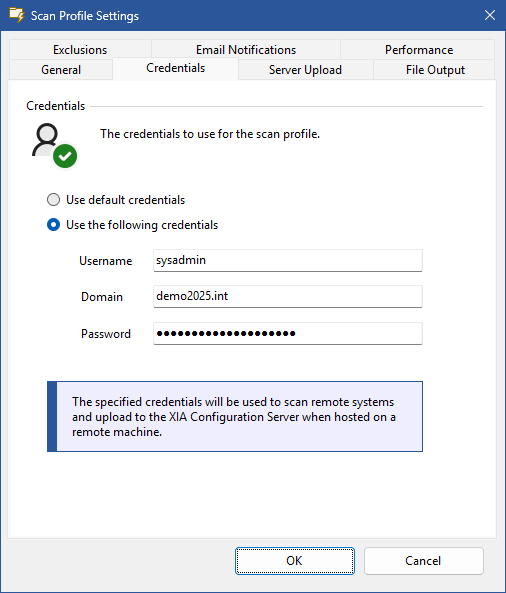 - The credentials are used when making a connection to the XIA Configuration Server when the server is not installed on the same machine and custom credentials are not specified on the server upload tab.