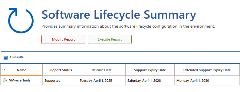 Provides summary information about the software lifecycle settings for each software package. If software lifecycle is not enabled for a software package, it is not displayed in this report.