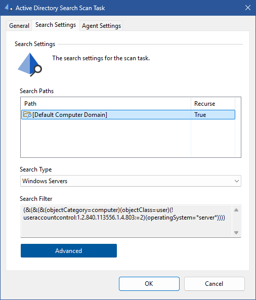 The following settings are available for the Active Directory search scan task.