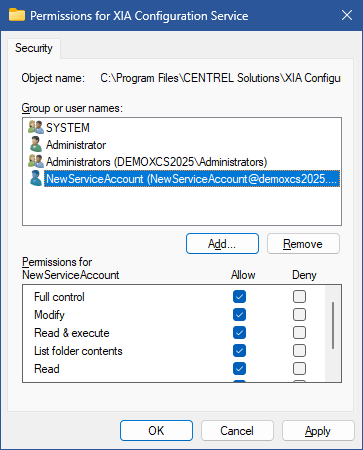 - Modify the NTFS permissions of the folder and ensure that the new service account, Administrators, and SYSTEM have full control.