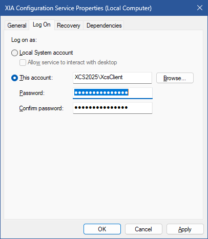 - Open the services management console (Start > Run > Services.msc) and open the XIA Configuration Service.