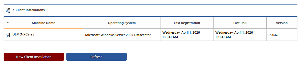 The client installations configuration section allows the managing of the XIA Configuration Client installations that are configured to register with the server.