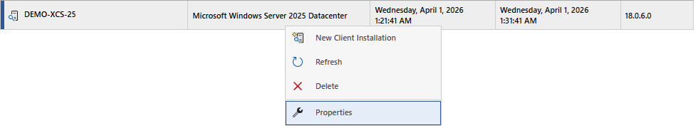 Right clicking a client installation shows the context menu.
