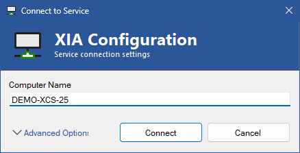 Once started the administration tools will prompt you to connect to the XIA Configuration Client service by default on the local machine.
