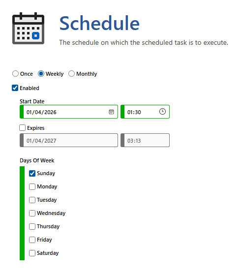 XIA Configuration ServerConfiguration SettingsSchedulerScheduled TasksDocumentation Generation Scheduled Task Schedule Determines the schedule on which the documentation generation scheduled task will execute.