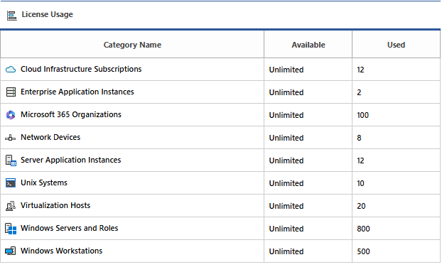 Determines the currently used license counts, certain license types provide an unlimited item count.