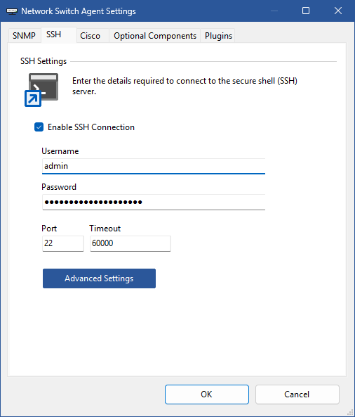 XIA Configuration ClientScan TasksNetwork SwitchAgent Settings SSH SSH The SSH settings for the network switch agent.