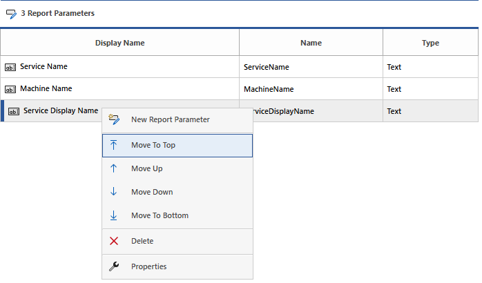 The order that the report parameters are displayed to the user can be modified by right clicking the report parameter and selecting to move up, move down, move to top, or move to bottom.