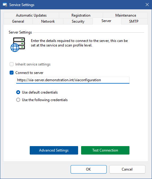 The server settings tab allows the configuration of a XIA Configuration Server connection. These settings are used for automatic updates and also as the settings to use for each scan profile, unless overridden.