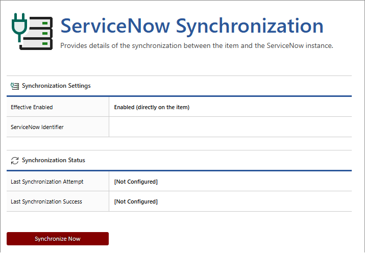 NOTE: This section is only visible if the ServiceNow connector is enabled, and the item type supports synchronization.