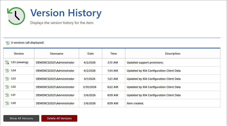Version control automatically creates new, numbered versions of items when they are modified by a user or updated by the XIA Configuration Client.
