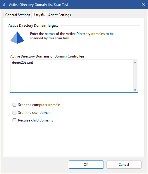The fully qualified DNS names of the Active Directory domains or a domain controller in a domain to scan, one per line. When the Scan Method of the agent settings is set to "Connect directly to Domain Controller" the value should be a domain controller name rather than a domain name.