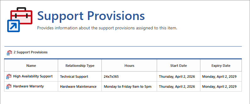 Support provision items can represent support contracts such as technical support agreements, warranties, or hardware maintenance agreements.