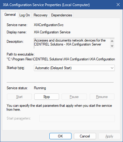 - Open the services management console (Start > Run > Services.msc) and open the XIA Configuration Service.