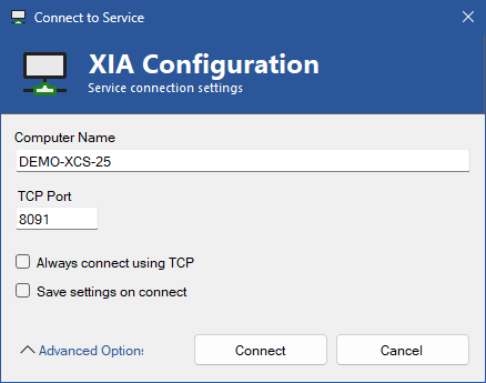 Once started the administration tools will prompt you to connect to the XIA Configuration Client service by default on the local machine.