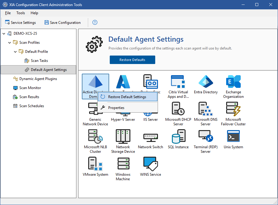 The default agent settings context menu is shown when a user right clicks one of the default agent settings.