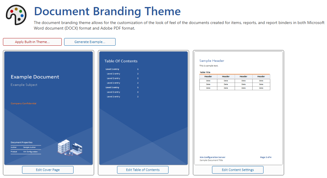 The document branding theme allows for the customization of the look of feel of the documents created for items, reports, and report binders in both Microsoft Word document (DOCX) format and Adobe PDF format.