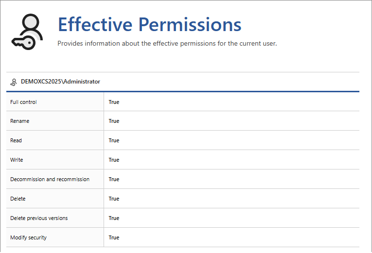 This section displays the user's effective security descriptor permissions for the currently viewed item.
