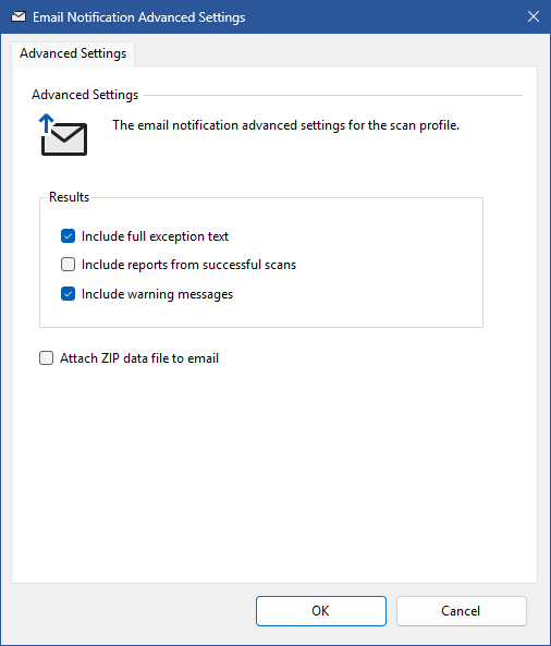 Determines whether the ZIP file created by the agent when running this scan profile should be attached to the email. For this option to be enabled the create a ZIP file setting must be enabled for the scan profile.
