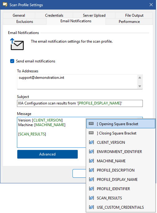 Right clicking or pressing the [ button whilst in a field in the email notifications user interface displays a context menu with the available variables.