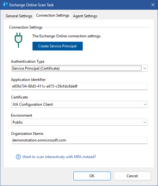 The name of the organization (tenant). The tenant identifier cannot be used as this in not compatible with the Exchange Online organization scan tasks.