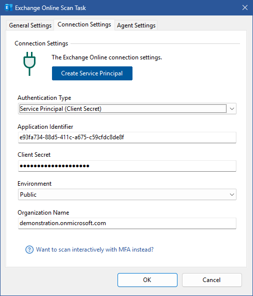 The name of the organization (tenant). The tenant identifier cannot be used as this in not compatible with the Exchange Online organization scan tasks.