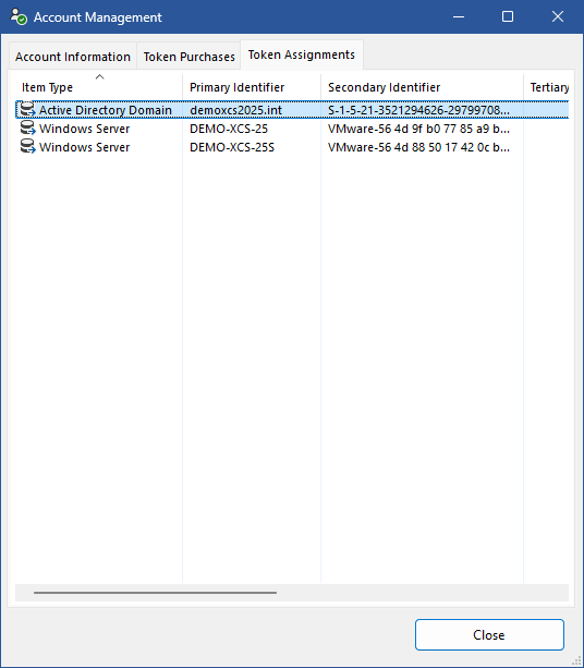 The token assignments tab provides information about the tokens that have been assigned by the logged in XIA Configuration Express account.