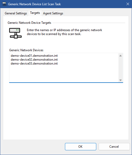 XIA Configuration ClientScan TasksGeneric Network DeviceGeneric Network Device List Scan Task Targets Generic Network Devices The IP addresses, NetBIOS names, or fully qualified domain names of the generic network devices to scan, one per line.