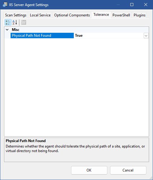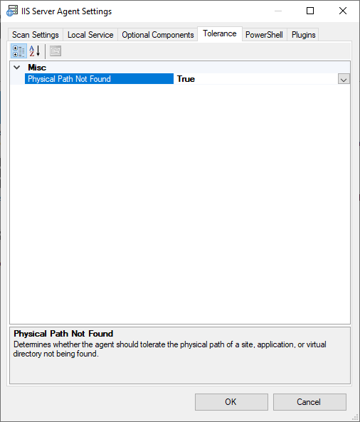 XIA Configuration ClientScan TasksIIS ServerAgent Settings Tolerance Physical Path Not Found Determines whether the agent should tolerate the physical path of a site, application, or virtual directory not being found.