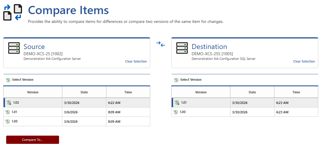 The item comparison dialog allows you to compare any two items of the same type, or two versions of the same item to see the differences.