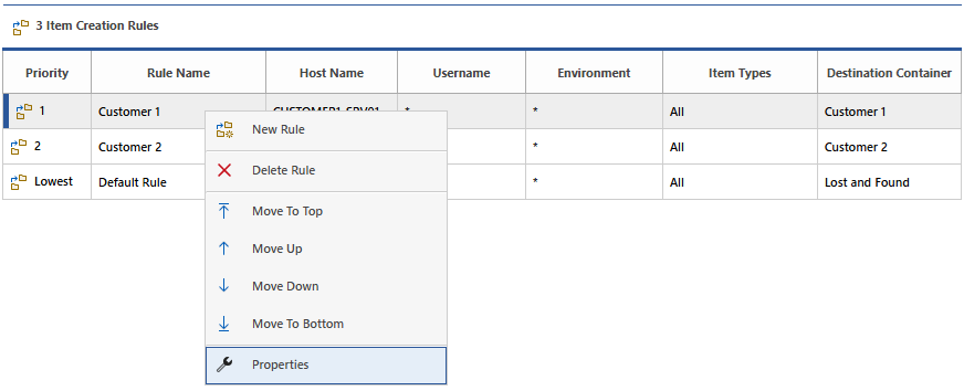 Displays the currently selected item creation rule in the item creation rule dialog.