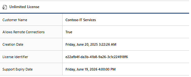 The name of the customer to which the product is licensed and their unique identifier in GUID format.