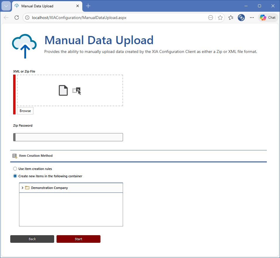 Optionally enter the Zip password if configured for the output by the XIA Configuration Client. The control is disabled if the file uploaded is an XML file or is a Zip file that is not encrypted.