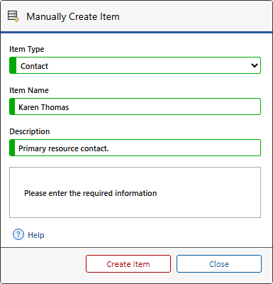 - Select the relevant item type from the drop down list. Note: the items in this list can be configured in the manual item creation settings.