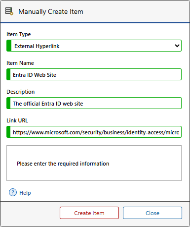 - For external hyperlink item types, you must enter the URL to assign.