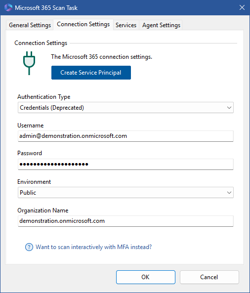 It is recommended to use a service principal with a certificate, or login interactively using multi-factor authentication using the Microsoft 365 agent UI.
