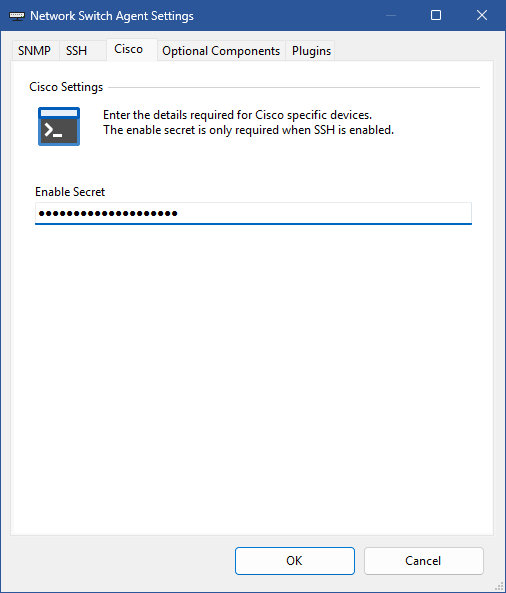 XIA Configuration ClientScan TasksNetwork SwitchAgent Settings Cisco Cisco Enable Secret The enable secret password to allow privileged access to Cisco network switches.