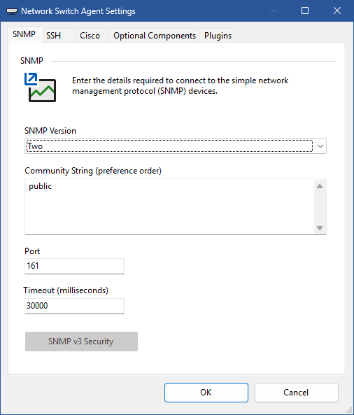 XIA Configuration ClientScan TasksNetwork Switch Agent Settings SNMP The SNMP settings for the network switch agent.