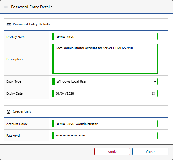 The password for the password entry. By default this is only displayed once the user has clicked the reveal password button.