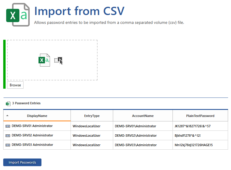 The prepared CSV file file can be imported by clicking the browse button, or by dragging file onto the drop area.
