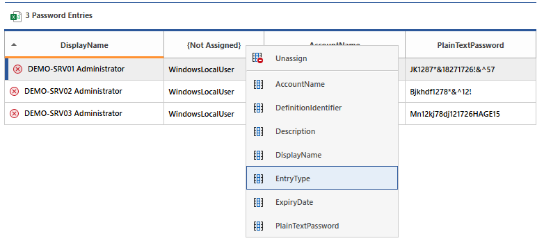 Right clicking on a column header will display the available fields to assign to the data.