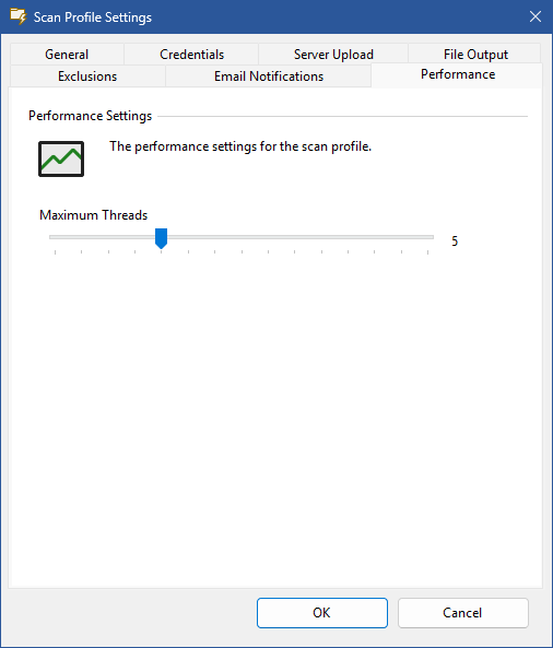 Determines the number of tasks this scan profile will run simultaneously. The more threads configured the more quickly the scan may complete, however more processor and network resources will be used.