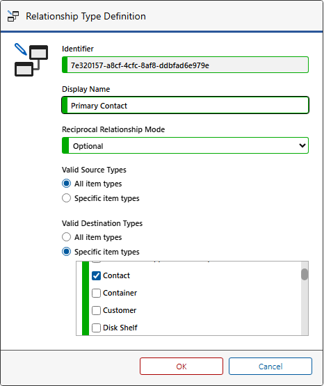 The relationship type definition dialog allows a relationship type to be created or modified.