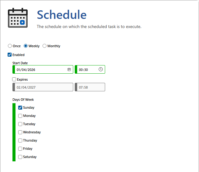 The weekly schedule is executed at the specified time on each of the selected days of the week.