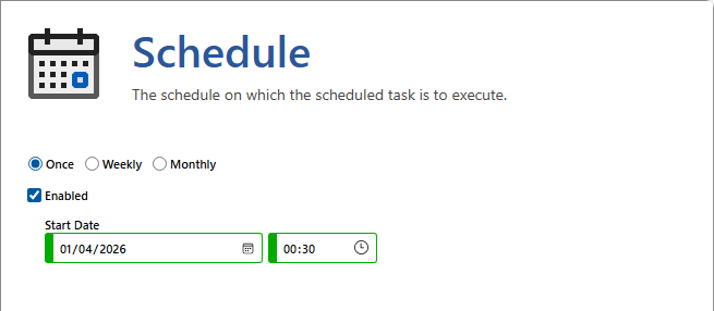 The schedule will be executed once only at the specified date and time.