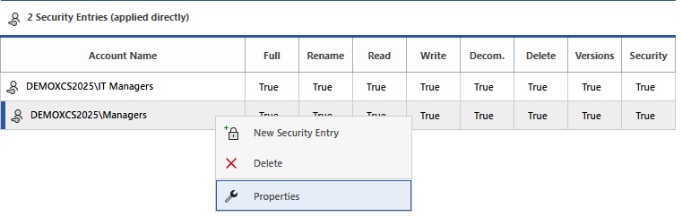 Right clicking a security entry in the security descriptor user interface displays the context menu.
